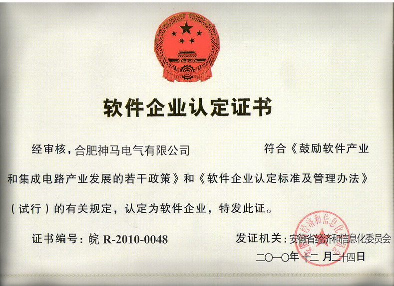 2010年12月24日,,,,,,我贝博BB电气有限公司通过了安徽省经济和信息化委员会的软件企业认定并获颁《软件企业认定证书》。 。 。。。。。